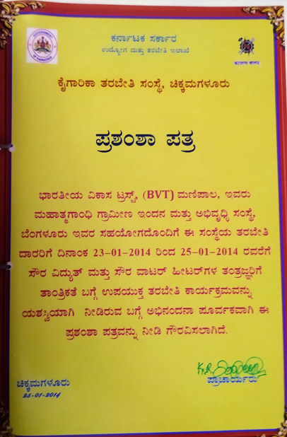 Appreciation by Govt ITI, Chikmagalur for outstanding work in training of more than 5000 Technicians of solar energy across Karnataka under the sponsorship by MGIRED/ KREDL, Govt of Karnataka.