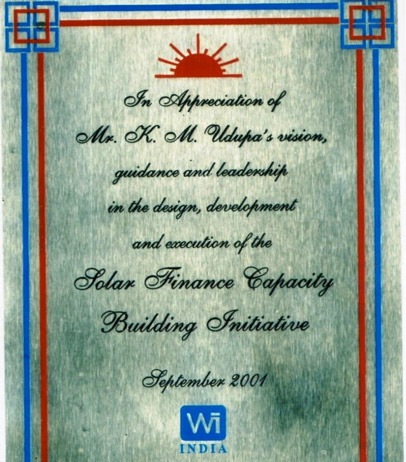 Appreciation by Winrock International India (WII) for BVTs outstanding efforts in Training and capacity building of FI-Bankers for effective financing of Solar energy solutions across India.